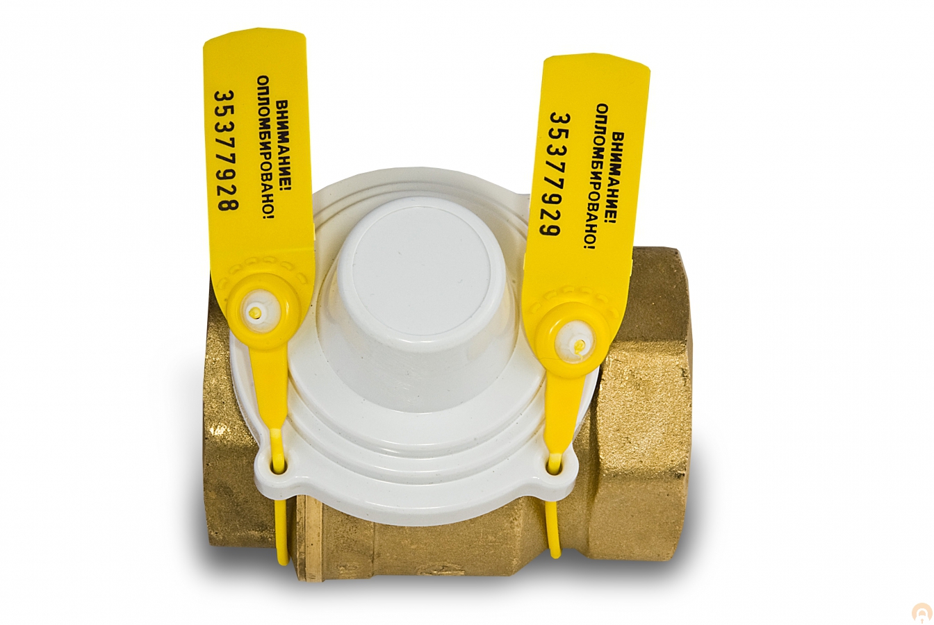 Пломбируется просто и быстро, с помощью двух номерных пластиковых пломб типа Фаст 330 или тосовых пломб с диаметром троса не более 2,5 мм. Установка блокиратора не требует дополнительных приспособлений, производится следующим способом — перед установкой следует закрыть кран подачи газа и снять с узла запирания крана рычаг, затем наложить блокиратор и надежно зафиксировать двумя номерными пломбами с двух сторон. Индивидуальный номер пломб занести в журнал учета.